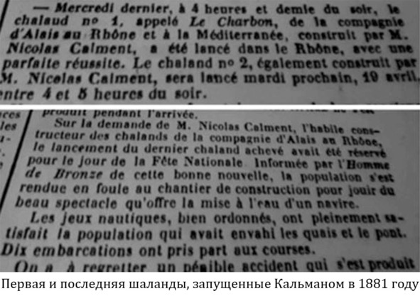Возможно, Николя Кальман построил несколько парусников, но в первую очередь он участвовал в производстве барж, известных как шаланды и пенелли, для перевозки угля и других товаров. Такие суда ходили по водам Роны на протяжении многих веков. Они спускались по течению с грузами из шахт и карьеров, используя большое весло сзади для руления.