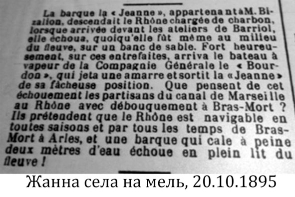 Патрисия Кутюрье обнаружила заметку 1895 года, которая подтверждает существование корабля под названием «Жанна» в Арле. Баржа, перевозящая уголь по Роне, села на мель, и ее пришлось вытаскивать с помощью парохода.