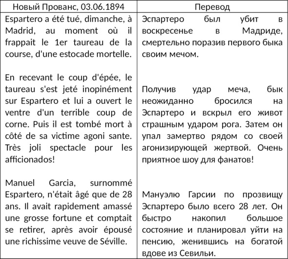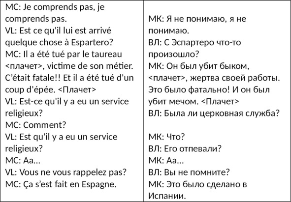 Кажется, что в книге была отредактирована транскрипция, и были добавлены некоторые новые фразы, чтобы мы увидели драматичную историю присутствия Жанны при смерти тореадора в Ниме. На оригинальной записи мадам Кальман сказала, что Эспартеро стал жертвой своей профессии, и был убит быком; она также упомянула меч и сказала, что отпевание проводилось в Испании.