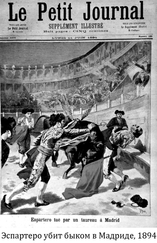 Похоже, что доктор Лебр неправильно услышал «партер» как «Эспартеро», и это привело к его следующему вопросу. Эспартеро было распространенным прозвищем среди матадоров. О каком из них они говорили? Известный испанский матадор по имени Эль Эспартеро (настоящее имя Мануэль Гарсия Куэста), умер во время своего выступления в Мадриде в 1894 году, когда Жанна еще не была замужем. Прежде чем прыгнуть на Эспартеро, бык получил смертельный удар мечом от матадора, что соответствовало описанию Кальман: