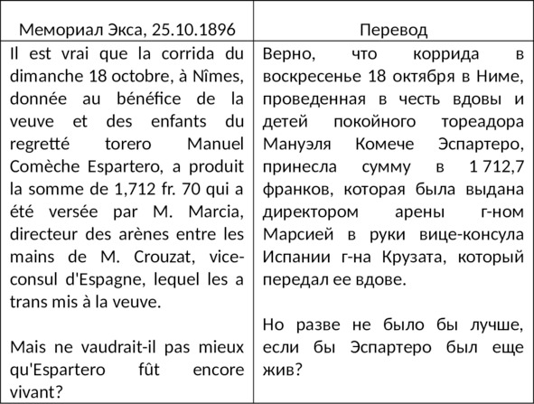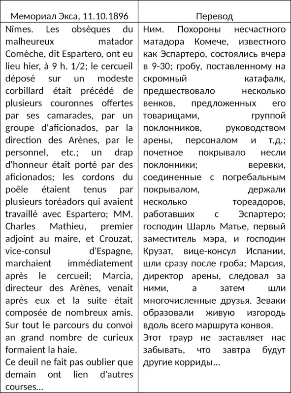 Когда Комече достал полотно, бык выскочил словно из ниоткуда, зацепил его за промежность, подвесил на мгновение и оставил в вертикальном положении. Рогоносец был настолько практичен в дарении подарков, что раздавал их без чьего-либо ведома, если не считать его жертвы. Когда Эспартеро ушел, общественность, которая не придала значения этому событию, не могла подозревать, что тореадор получил серьезную травму; настолько серьезную, что врачи обнаружили разрушение кишечника, в результате которого случился перитонит, а затем смерть, которая наступила 7 числа того же месяца. Кроме этой роли жертвы, которая является очень неприятной ролью, я не знаю, сделал ли Эспартеро из Валенсии что-то замечательное в своей жизни, а если и сделал, то никто об этом не знал. [31]Это описание предполагает, что в отличие от своего тезки Мануэля Гарсии, погибшего в Мадриде, Эскапартеро, который умер в Ниме, не был выдающимся мастером. С этой точки зрения, Мануэль Гарсия опять лучше соответствует словам Кальман. Тем не менее, доктор Лебр решил, что она говорит о Мануэле Комече. История о том, как она стала свидетелем смерти Эспартеро, была более драматичной, чем история о том, что она знала, что знаменитый Эспартеро умер.