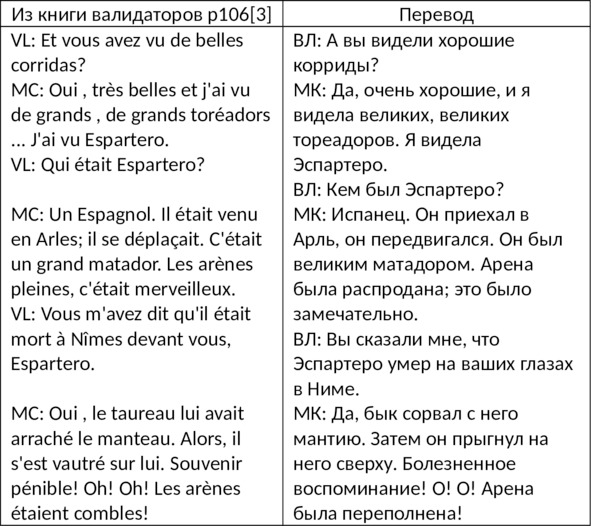 Транскрипция интервью от 29 января 1993 года в книге валидаторов включает в себя упоминание доктора Лебра о том, что мадам Кальман была свидетелем ужасной смерти Эспартеро в Ниме [2], стр. 100; [3], стр. 106. Она подтверждает и предоставляет дальнейшие подробности о том, как бык убил матадора, прыгнув на него сверху. Это снова соответствует истории смерти Мануэля Гарсии в Мадриде, но не соответствует описанию Вентурой смерти Мануэля Комече в Ниме: