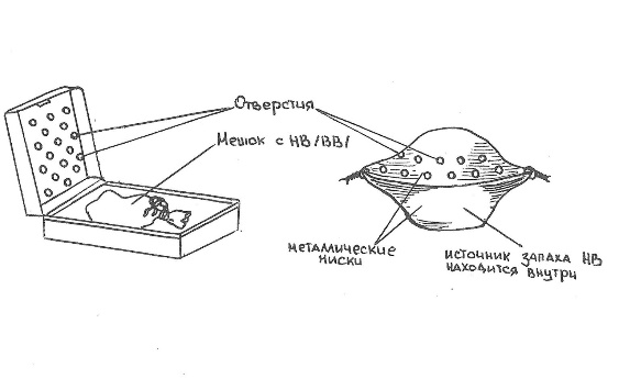 Закладки представляют собой зашитые и опечатанные мешочки из плотной ткани, в которых хранится разное количество искомого вещества. Все закладки желательно помещать в контейнеры, образцы которых представлены на рис.3. Контейнер предназначен для защиты закладки от механических повреждений. В контейнере необходимо проделать отверстия для свободного распространения запаха.