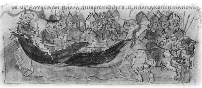 Князь Владимир Святославич в походе против болгар со своим дядей Добрыней на кораблях и на конях. Радзивилловская летопись