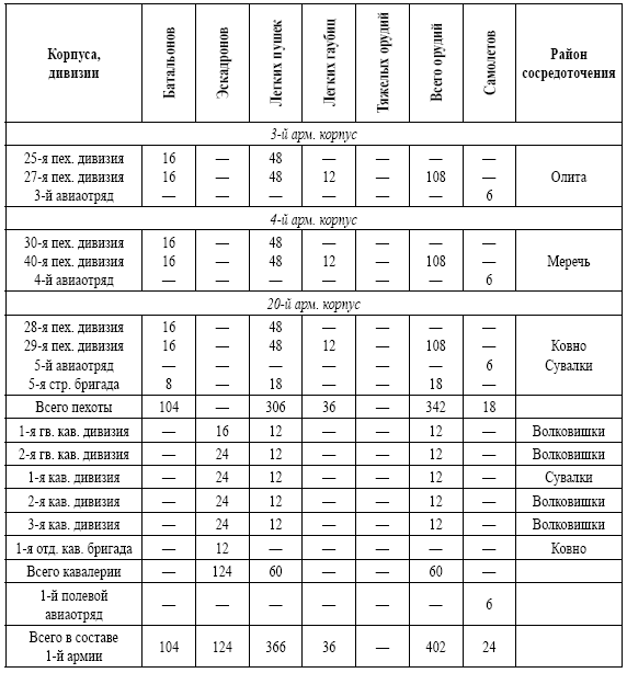 Второочередные пехотные дивизии, тяжелая артиллерийская бригада, а также второочередные казачьи части, назначенные в качестве войсковой конницы, к началу наступательной операции не прибыли. Ввиду того что из состава полевых войск часть была оставлена для несения различных видов караульной службы, а из состава кавалерийских дивизий казачьи полки были даны временно в качестве заместителей войсковой конницы, т.е. были распылены повзводно и посотенно между пехотными частями для разведки и службы связи в пехоте, армия фактически располагала 96 батальонами и 106 эскадронами и сотнями.