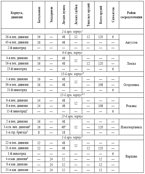 Таким образом, общая идея операции могла бы заключаться в охвате противника с обоих флангов. Обеспечение операции с его левого фланга достигается р. Вислой и крепостью Новогеоргиевск и перевозимыми к Варшаве частями гвардейского и 1‑го арм. корпусов, первые эшелоны коих начнут прибывать в Варшаву с двенадцатого дня мобилизации.