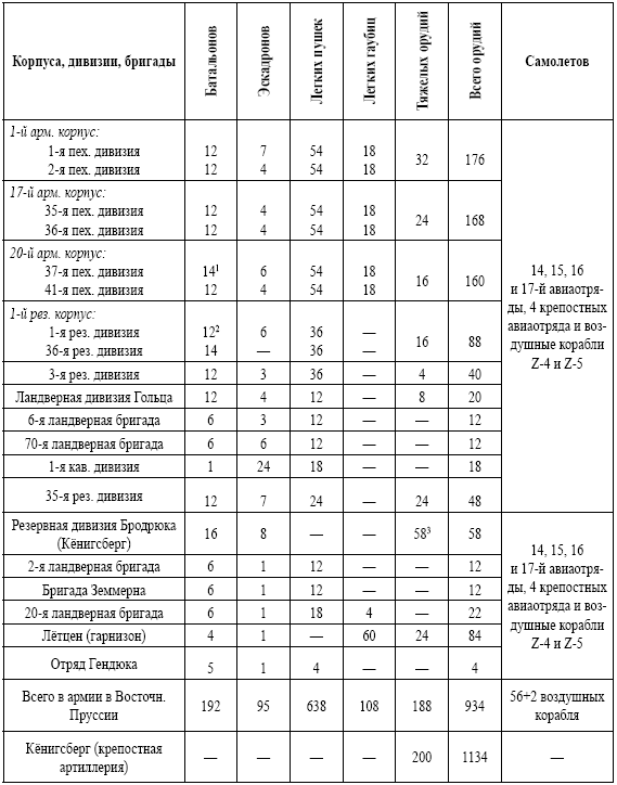 Таким образом, к началу операций в Восточной Пруссии русские имели превосходство над немцами в пехоте на 72 батальона, в кавалерии на 101 эскадрон. Следовательно, двойного якобы превосходства русских сил над германскими или подавляющего превосходства вовсе не было, как об этом принято писать, особенно у немцев.