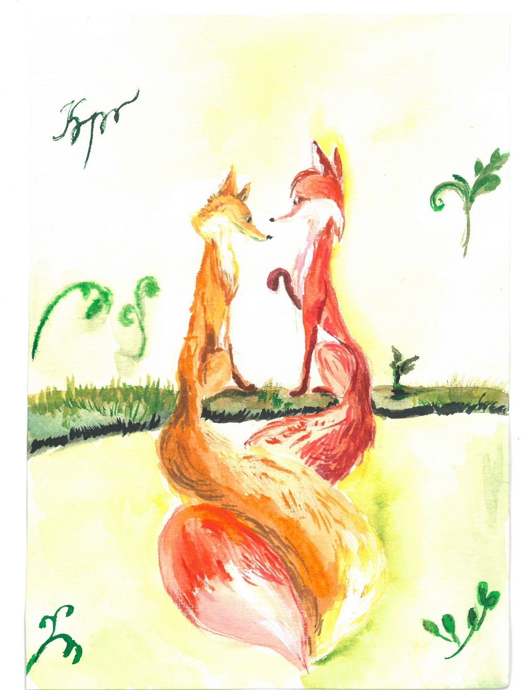 Солнце стояло в закате над полянкой, а там, далеко за горизонтом, шагали два лиса: один был черен, как смоль, а другой сиял золотисто-рыжими оттенками своей шубки в лучах светила.