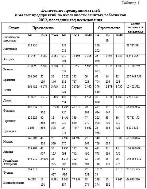 Так, по данным Евростата7 число малых предприятий в России значительно меньше, чем в таких странах как Италия, Германия, Франция, однако численность населения в России больше, чем в вышеуказанных странах (Таблица 1).