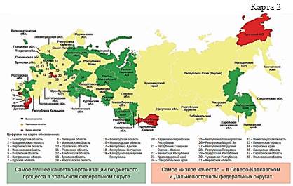 Аналогичным образом различается и управление финансами в различных регионах страны. Наиболее неэффективное управление финансами наблюдается в Чукотском АО, Республике Тыва, Республике Дагестан, что видно из соответствующей карты13.( Карта 2)