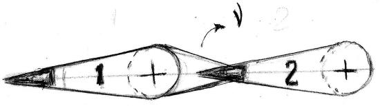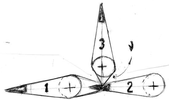 Причём, третий диполь может присоединиться к двух-дипольной структуре двумя способами: как показано на рис. 2 или в перевёрнутом виде – минусом вниз, а плюсом наверх. Тогда нейтрино вылетит при объединении 1-го и 3-го диполей.