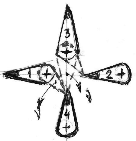 Заметим, что при образовании двух-дипольной структуры вылетает одна дополнительная частичка нейтрино. Соответственно при образовании трёхдипольной структуры – ещё одна. Так что ядро трехдипольной структуры оказывается ещё более сжатым по сравнению с двух-дипольной. Далее можно ожидать образования четырёхдипольной структуры после присоединения 4-го диполя. Смотрим на рисунок 3.