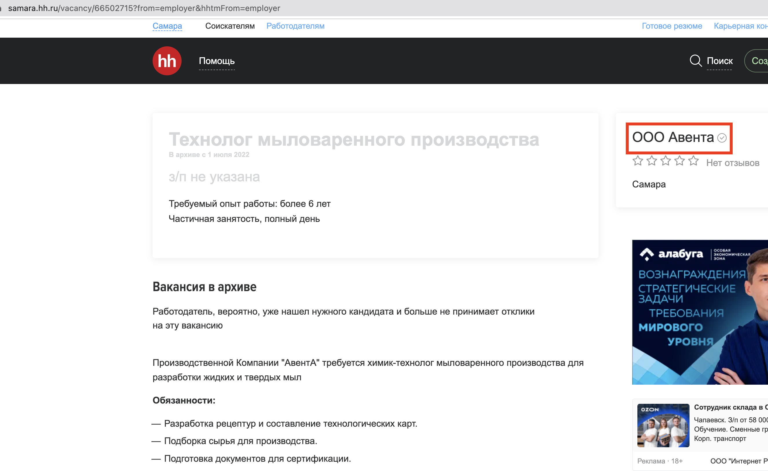 Рис. 3. Фрагмент вакансии ООО «Авента» на hh.ru