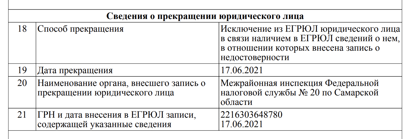 Рис. 4. Фрагмент выписки другого ООО «Авента» из ЕГРЮЛ, содержащий сведения о прекращении юридического лица