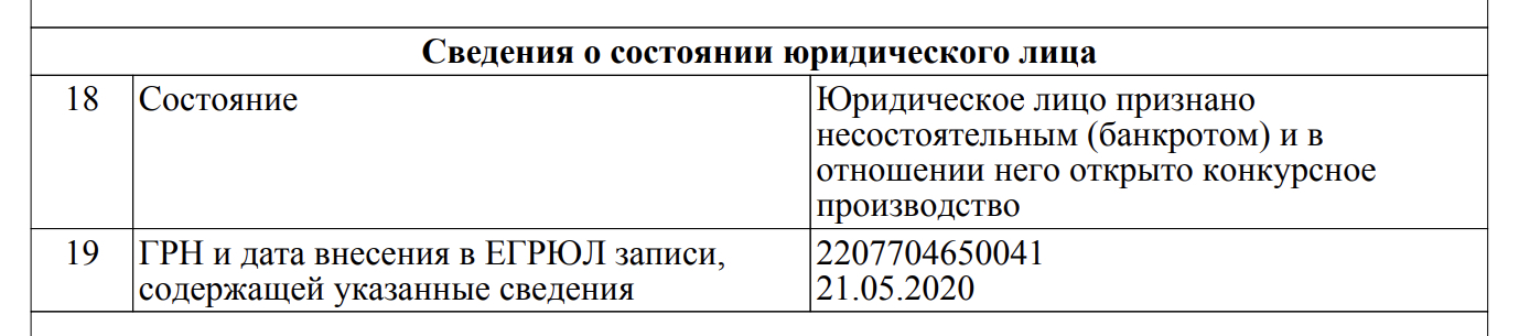 Рис. 5. Фрагмент выписки из ЕГРЮЛ, содержащий сведения о состоянии юридического лица, которое находится в процессе банкротства