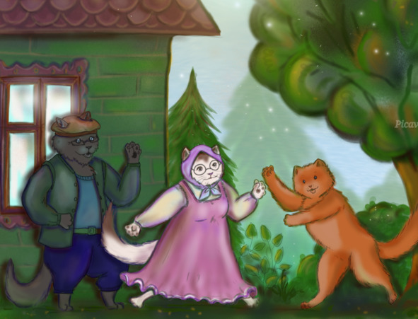 Лапки Котика сами бежали вперёд, и он не заметил, как добрался до милого сердцу домика. Увидев, что его встречают, усатик подпрыгнул и радостно помчался вперёд быстрее! Бросив чемоданчик, Котик по очереди обнял Бабушку и Деда. Те расцеловали его в ответ в мохнатые щёчки, пообнимали вволю. Довольные, взялись за лапки и пошли пить чай.