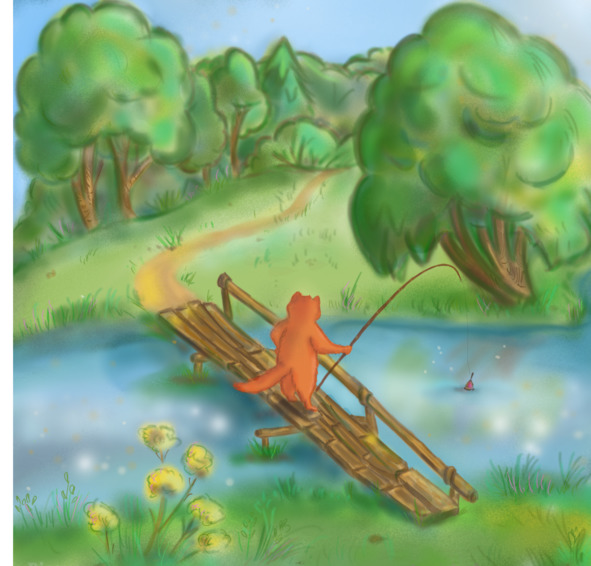 Небольшая речушка Хвостик неспешно скользила между зеленеющих лугов и рощ. В прохладных водах росли прибрежные камыши. В тени нежных кувшинок укрывалась рыба, а ночами по дну бродили важные усатые раки. Здесь Котик любил рыбачить с узкого мостика. В ожидании клёва он наблюдал за блестящими стрекозами. Те играли в догонялки и катались на поплавке. Иногда к игре присоединялись водомерки. Они гоняли по водной глади, очерчивая круги и распугивая рыбу. Усы Котика недовольно подрагивали, но он оставался на своём рыбацком месте. Уж больно оно ему нравилось!
