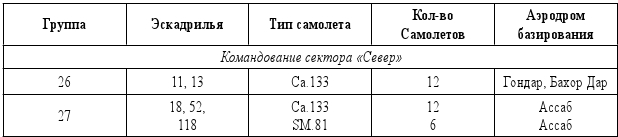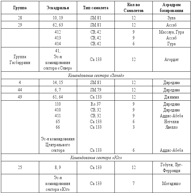 Военную авиацию колониальных войск возглавлял генерале Пьетро Пинна. Она включала в себя около 350 боевых самолетов, в основном устаревших конструкций. Многие из боевых машин, как, например, бомбардировщики Ca.133 и SM.81, принимали участие еще в эфиопской кампании середины 30‐х годов. Нужно отметить, что из-за специфических погодных условий и сложностей с поставками запчастей в боевой готовности находилась только половина из этих самолетов. Общий боевой состав ВВС Италии в Восточной Африке без учета транспортных машин приведен в таблице ниже.