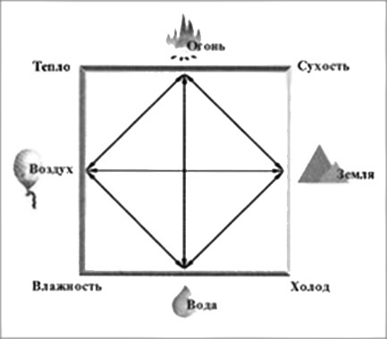 Аристотель заново изложил и исправил учение Эмпедокла о четырех стихиях. Аристотелю удалось путем логических и последовательных рассуждений вывести их свойства и происхождение из более простых и рациональных принципов. Исследуя основные свойства тел, он нашел, что все они сводятся к двум основным парам: 1-е сухое и влажное, 2-е горячее и холодное. Если произвести алгебраическое перемножение этих 2-х биномов то и получаются 4 основных элемента. Сочетание сухого и горячего дает стихию огня, сочетание влажного и горячего – стихию воздуха, сухого и холодного это стихия земли, а влажного и холодного – вода. Эти выводы Аристотеля были впоследствии широко использованы в астрологии, в особенности в эзотерической ее части развитой позднее Посидонием. Учение о четырех стихиях, конечно не было открыто Аристотелем, как мы помним, о нем знали еще древние египтяне и халдеи, но именно Аристотелю с его аналитическим умом удалось построить стройную и завершенную их систему.