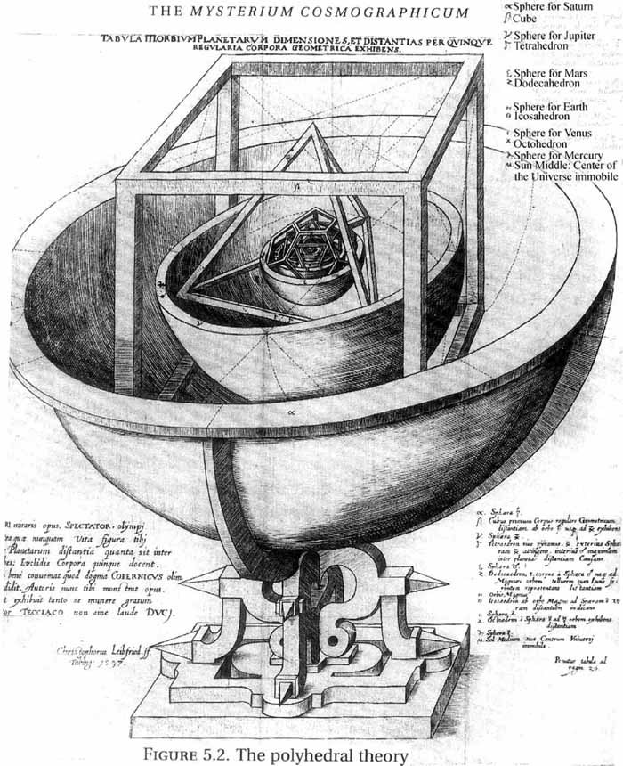 Кеплер указал также на соответствие отношений между расстояниями планет и музыкальными тонами в диатонической гамме, не исключая переход к хроматической гамме в случае доведения числа планет (включая Солнце и Луну) до двенадцати. Тем самым Кеплер предвосхитил современное представление о квантованности планетных орбит, намеченное уже правилом Тициуса-Боде. Эта «музыка сфер», по Кеплеру, должна быть слышима только Солнцу, дирижёру всего оркестра – Солнечной системы. В работе «Mysterium Cosmographicum» («Космографическая тайна», 1596 г.) Кеплер установил числовую связь между расстояниями планет от Солнца и размерами правильных вписанных в сферу многогранников. В настоящее время идея псевдокристалличности Солнечной системы уже серьёзно обсуждается теоретиками. Среди других наиболее известных его работ – труд «Astronomia nova» («Новая астрономия», 1609 г.).