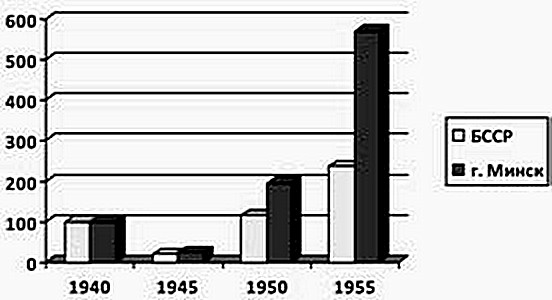 Рис. 1. Темпы роста валовой продукции промышленности по БССР и г. Минску (% к 1940 г.)[25]