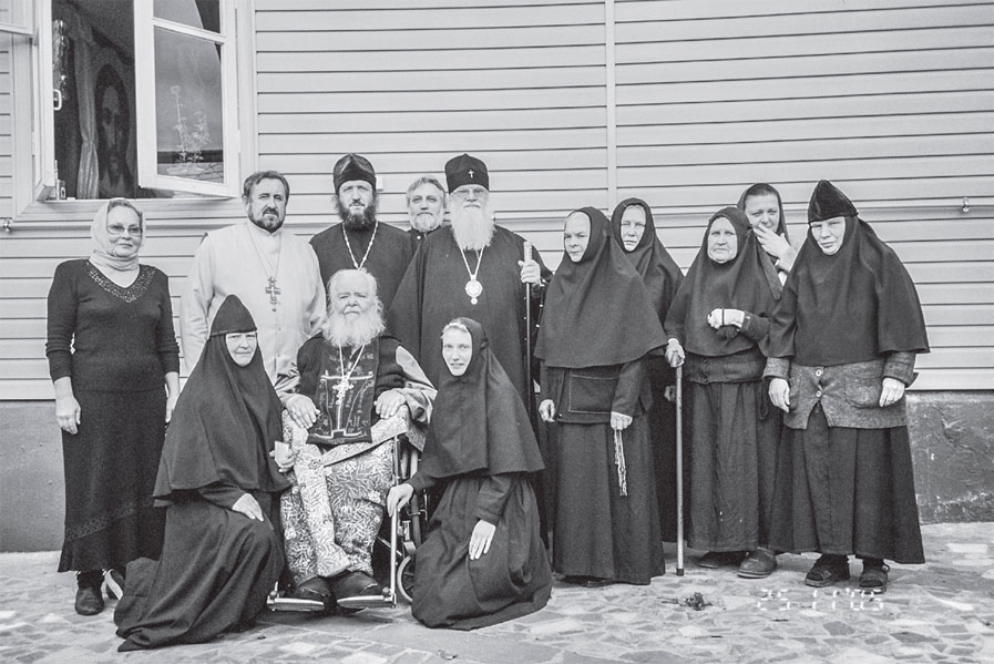 Митрополит Исидор (Кириченко) у отца Симеона. Справа от владыки: протодиакон Сергий, протоиерей Евгений Хаджипараш, протоиерей Иоанн Мартынюк. Справа от о. Симеона – монахиня Варвара, слева – инокиня Тамара (ныне мон. Тавифа); верхний ряд справа налево: мон. Агапия (ныне схимон. Афанасия, послушница Мария, мон. Елисавета, мон. Макрина (ныне схимон. Моисея), мон. Евдокия (ныне схимон. Екатерина)