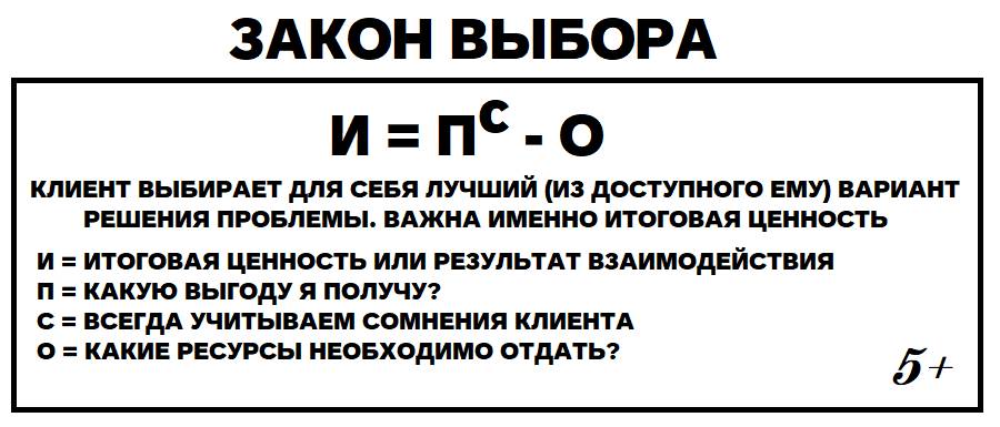 – Тренер: Формула Закона Выбора очень проста: «Итог = Получу – Отдам». Осознанно или неосознанно, совершая покупки, мы ежедневно повторяем и повторяем этот Закон, сопоставляя выгоды и пользы предложения с затратами денег, времени и сил. «Ит = пc – о» то же самое, что и «E = mc²» в физике! Плюс погрешность на сомнения (с), позже расскажу, как их развеять. Нам важен «Итоговый результат» или «Итоговая ценность обмена», как её увеличить?
