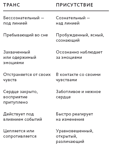 Если мы блуждаем в дебрях, то сможем найти просвет, просто сделав паузу и обратившись от шумных мыслей к осознаванию каждого мгновения. Я говорю об этом пробужденном и непосредственном осознавании как о присутствии. Его также называют сознанием, духом, природой будды, подлинной природой, пробужденным сердцем и умом. Соединяясь с таким присутствием, мы открываемся тому, что происходит у нас внутри. Открываемся изменчивому потоку ощущений, чувств и мыслей и не сопротивляемся ему. Благодаря этому мы проживаем мгновения своей жизни с ясностью и состраданием. Этот переход от блуждания в умственных и эмоциональных реакциях к полному присутствию и есть пробуждение от транса.