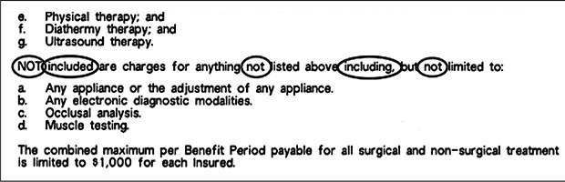Извлечение из Договора по добровольному медицинскому страхованию, показанное на рисунке 1.1, сложно понять любому человеку, будь то юрист или обычный гражданин. Головоломку создают тройное использование в одном предложении частицы «не» (not) и дважды упомянутое слово «включен» (included). Это что угодно, но только не информационное сообщение.