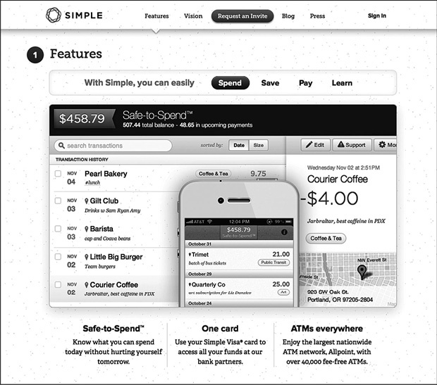 Сайт компании Simple имеет интерактивный интерфейс с функциями поиска и просмотра обновлений по всем финансовым операциям (можно увидеть не только сумму, потраченную, например, в прошлый четверг, но и список звонков). Будут ли востребованы такие метаданные? Вполне возможно. По крайней мере, клиенты знают, что такая информация существует и с ней можно ознакомиться в любой момент. В отличие от текстовых массивов, набранных мелким шрифтом, которые навязчиво предоставляют клиентам банки, Simple собирает информацию под конкретного пользователя системы; поэтому такая услуга потенциально полезна и актуальна. А кроме того, в Simple можно найти полезные «фичи»: например, одновременно с перечнем операций на экране появляется карта с указанием мест, где совершались покупки. Такие «напоминалки» понравятся многим (рисунок 2.1).