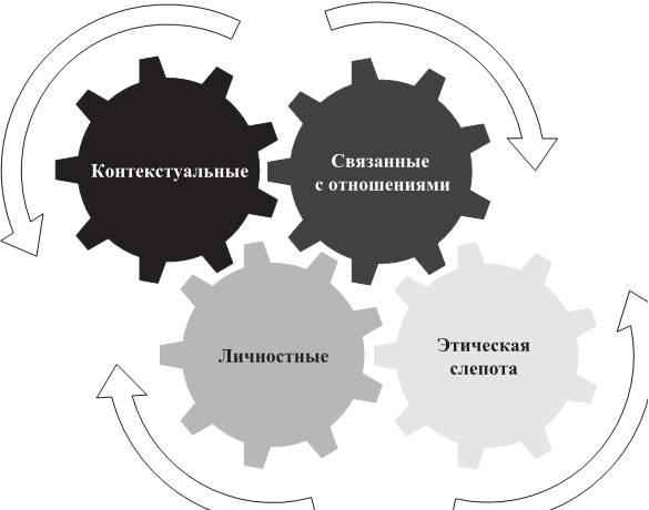 Поскольку процесс построения этической культуры по природе своей адаптивен, здесь не будет попыток предложить новую теорию или модель. Для этого понадобилось бы разработать решения проблемы адаптации. Чтобы выявить причины неэтичного поведения в бизнес-среде, я использую по преимуществу современные психологические исследования и свой личный опыт. В главе 1 рассматривается обстановка в организации и то, как среда, в которой человек работает, оказывается едва ли не определяющим фактором неэтичного поведения (хотя ее редко видят в этом качестве). Она же формирует и наши моральные установки. В главе 2 рассматриваются отношения между людьми. Особое внимание уделяется тому, как нарушенная групповая динамика побуждает людей к поведению и решениям, которые они при других обстоятельствах сочли бы недопустимыми. В главе 3 рассматриваются три фактора, существующие во всех организациях и способные вызвать к жизни худшее, что только есть в несовершенной природе человека. Эти факторы – деньги, власть и страх. И наконец, в главе 4 показано, как несовершенство нашего мышления может привести к добровольной слепоте и подтолкнуть нас к безотчетному и неосознанному нарушению морально-этических норм. Как демонстрируется на рисунке В.1, эти четыре фактора не являются взаимоисключающими. Скорее, они накладываются друг на друга и в совокупности приводят к моральному краху. В заключении книги исследуется роль образования, обсуждаются функции специалиста по этике и обобщаются уроки для руководителей, вынесенные в конец каждой главы.
