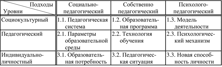 При социально-педагогическом подходе оперируют прежде всего способами упорядочения социокультурной среды как основы функционирования и развития образовательных систем. При психолого-педагогическом в центре находится освоение обобществленного опыта как основа образования человека. При собственно педагогическом подходе концентрируют внимание на эффективности педагогического процесса и конструировании содержания, способов и форм взаимодействия субъектов.