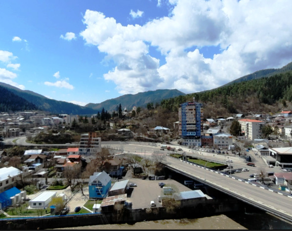 Подхожу к балконной двери, открываю, и у меня аж дух перехватывает от открывшейся перспективы. Голубое солнечное небо с кучевыми облаками, как с картинки. А ниже в рамке гор Боржоми излучина Куры, выплывающая как будто из города и разворачивающаяся на всю ширину панорамы, прижимается к скале на которой стоит санаторий и убегает бурно вниз под мост. Боржомские дома частные и многоэтажки, все смотрится комплексно и аккуратно, как на макете архитектора. И прямо напротив Храм – Церковь Пресвятой Богородицы. Фантастика.