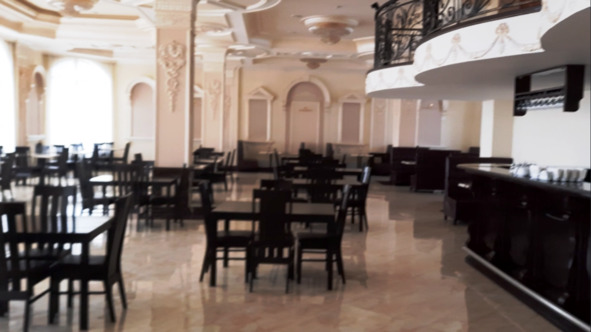 Вау! Ресторан шикарный. Высокие потолки, балкон, люстры, отделка стен и колон. Тяжелые столы и стулья цвета темного ореха.
