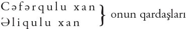 Cəfərqulu xan. Qardaş, buyur, bu təllin31 üstünə çıx. Qoşun əhli səni ziyarət eləsin, yoxsa hamı səni ölmüş bilir.