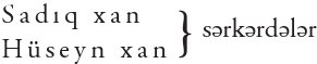 Sadıq xan. Şahın iltifatından mən də şaki75 ola bilmərəm. Mənə da az əsir bağışlamayıb. Əlavə necə ki, görürsünüz, cəmi atlı qoşuna sərkərdə mən Sadıq xanam!