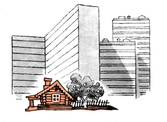 Когда-то дом стоял в саду, но место понадобилось для нового здания, яблони вырубили, землю упрятали под бетон, под асфальт, чтоб люди в дождик не пачкали ноги, и осталась возле деревянного дома одна яблоня. Под ней в дощатом шалаше и жила курица Ряба.