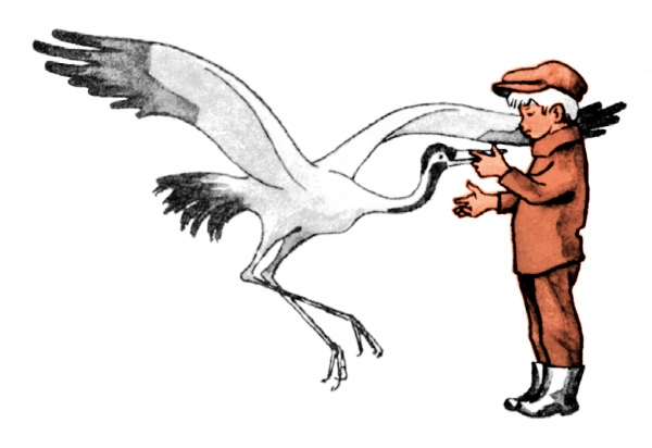 Они гладили журавлиные крылья, они угощали Журавлика. И он подумал: