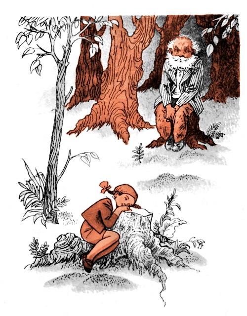 На зиму Старый Пень погружался в сугроб. Но хоть и был он стар, а тоже, видно, ждал весны, торопился к ней навстречу. Проклюнувшись в сугробе, он-то и указывал Любе Тряпичнице первый весенний день, а в первый день осени она находила на нём жёлтый лист.