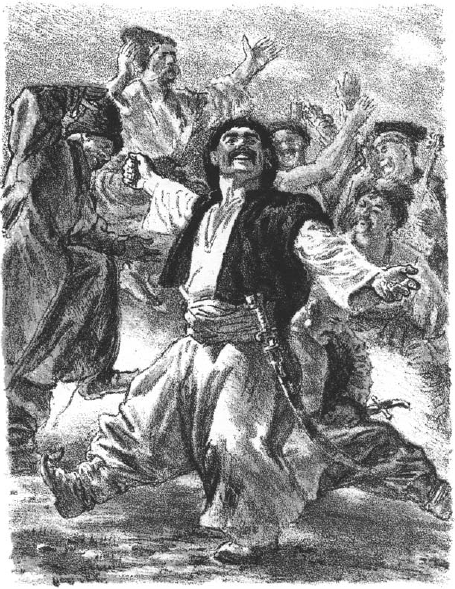 Путники выехали на обширную площадь, где обыкновенно собиралась рада[65]. На большой опрокинутой бочке сидел запорожец без рубашки; он держал ее в руках и медленно зашивал на ней дыры. Им опять перегородила дорогу целая толпа музыкантов, в середине которых отплясывал молодой запорожец, заломивши шапку чертом и вскинувши руками. Он кричал только: «Живее играйте, музыканты! не жалей, Фома, горелки православным христианам!» И Фома, с подбитым глазом, мерял без счету каждому пристававшему по огромнейшей кружке. Около молодого запорожца четверо старых выработывали довольно мелко ногами, вскидывались, как вихорь, на сторону, почти на голову музыкантам, и вдруг, опустившись, неслися вприсядку и били круто и крепко своими серебряными подковами плотно убитую землю. Земля глухо гудела на всю окружность, и в воздухе далече отдавались гопаки[66] и тропаки, выбиваемые звонкими подковами сапогов. Но один всех живее вскрикивал и летел вслед за другими в танце. Чуприна[67] развевалась по ветру, вся открыта была сильная грудь; теплый зимний кожух был надет в рукава, и пот градом лил с него, как из ведра. «Да сними хоть кожух! – сказал, наконец, Тарас, – видишь, как парит!» – «Не можно!» – кричал запорожец. «Отчего?» – «Не можно; у меня уж такой нрав: что скину, то пропью». А шапки уж давно не было на молодце, ни пояса на кафтане, ни шитого платка: все пошло куда следует. Толпа росла; к танцующим приставали другие, и нельзя было видеть без внутреннего движенья, как все отдирало танец самый вольный, самый бешеный, какой только видел когда-либо свет и который, по своим мощным изобретателям, назван казачком.