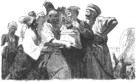 Довбиш вынул тотчас из кармана палки, которые он взял с собою, очень хорошо зная окончание подобных происшествий. Литавры грянули, – и скоро на площадь, как шмели, стали собираться черные кучи запорожцев. Все собрались в кружок, и после третьего боя показались, наконец, старшины: кошевой с палицей[85] в руке, знаком своего достоинства, судья с войсковою печатью, писарь с чернильницею и есаул с жезлом[86]. Кошевой и старшины сняли шапки и раскланялись на все стороны казакам, которые гордо стояли, подпершись руками в бока.