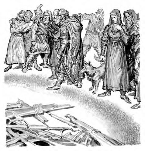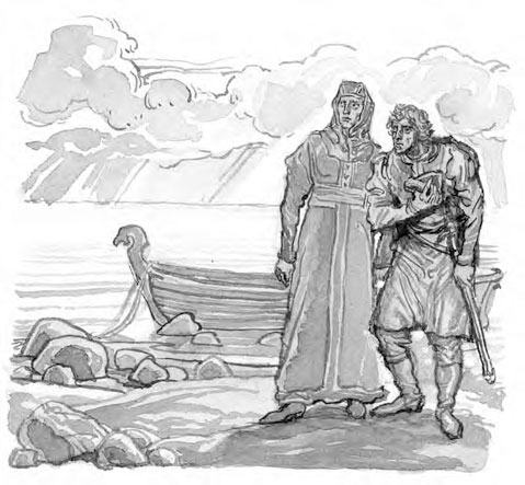 Феодосий обнял юношу, называя его сыном своим. Они вошли в хижину, где горела лампада. Старец дрожащею рукою снял булатный меч, на стене висевший, и, вручая его Мирославу, сказал: «Вот последний остаток мирской славы в жилище отшельника! Я хотел сохранить его до гроба, но отдаю тебе; Ратьмир, предок мой, изобразил на нем златыми буквами слова: «Никогда врагу не достанется»…» Мирослав взял сей древний меч с благоговением и гордо ответствовал: «Исполню условие!» Марфа долго еще говорила с мудрым Феодосием о силах князя Московского, о верных и неверных союзниках Новаграда и сказала наконец юноше: «Возвратимся, буря утихла. Народ покоится в великом граде, но для сердца моего уже нет спокойствия!» Старец проводил их с молитвою.