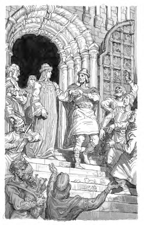 На другой день Новгород представил вместе и грозную деятельность воинского стана и великолепие народного пиршества, данного Марфою в знак ее семейственной радости. Стук оружия раздавался на стогнах. Везде являлись граждане в шлемах и в латах, старцы сидели на Великой площади и рассказывали о битвах юношам неопытным, которые вокруг их толпились и еще в первый раз видели на себе доспехи блестящие. В то же время бесчисленные столы накрывались вокруг места Вадимова; ударили в колокол, и граждане сели за них; воины клали подле себя оружие и пировали. Рука изобилия подавала яства. Борецкие угощали народ с восточною роскошию. Мирослав и Ксения ходили вокруг столов и просили граждан веселиться. Юный полководец ласково говорил с ними, юная супруга его кланялась им приветливо. В сей день новогородцы составляли одно семейство. Марфа была его матерью. Она садилась за всяким столом, называла граждан своими гостями любезными, служила им, дружески беседовала с ними, хотела казаться равною со всеми и казалась царицею. Громогласные изъявления усердия и радости встречали и провожали ее; когда она говорила, все безмолвствовали; когда молчала, все говорить хотели, чтобы славить и величать посадницу. За первым столом и в первом месте сидел древнейший из новогородских старцев, которого отец помнил еще Александра Невского, – внук с седою брадою принес его на пир народный. Марфа подвела к нему новобрачных, он благословил их и сказал: «Живите мои лета, но не переживайте славы новогородской!..» Сама посадница налила ему серебряный кубок вина фряжского, старец выпил его, и томная кровь начала быстрее в нем обращаться. «Марфа! – говорил он. – Я был свидетелем твоего славного рождения на берегу Невы. Храбрый Молинский занемог в стане; войско не хотело сражаться до его выздоровления. Мать твоя спешила к нему из великого града, и когда мы разили немецких рыцарей, когда родитель твой, еще бледный и слабый, мечом своим указывал нам путь к их святому прапору, ты родилась. Первый вопль твой был для нас гласом победы, но Молинский упал мертвый на тело великого магистра Рудольфа, им сраженного!.. Финский волхв, живший тогда на берегу Невы, пророчествовал, что судьба твоя будет славна, но…» Старец умолк. Марфа не хотела изъявить любопытства.