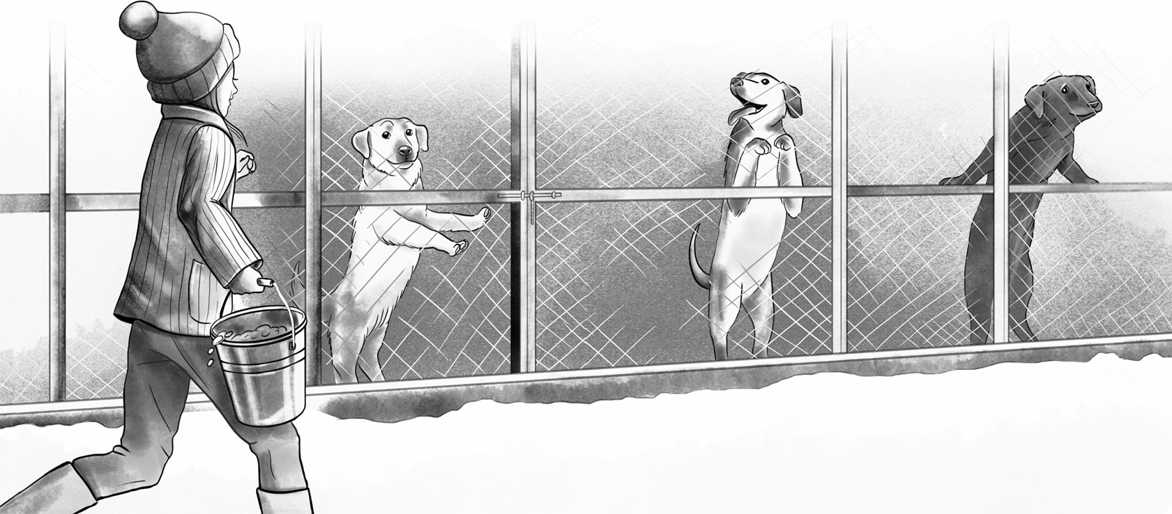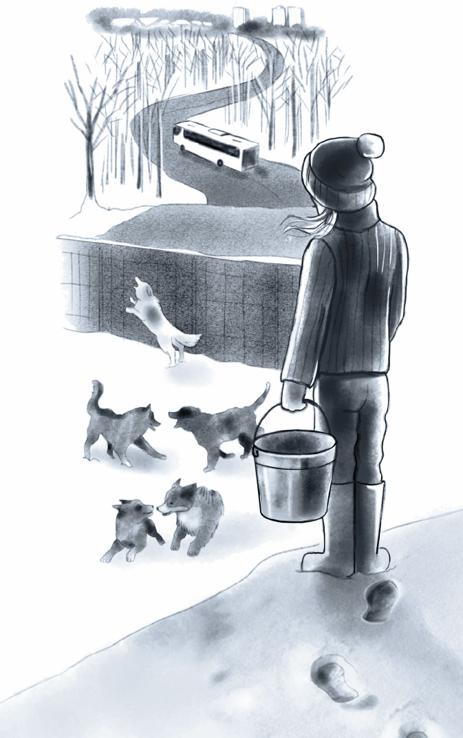 По домику ты порции для всех разносишь сразу в мисках. А после берёшь чистое ведро, накладываешь в него ко́рма до краёв и выбегаешь во двор. Только телогрейку накинуть не забудь, а то замёрзнешь сразу, а назад уже будет неохота возвращаться – так и будешь на бегу стучать зубами и подпрыгивать. И думать, как хорошо зарыться руками в чью-то шерсть, прижаться к боку теснее и замереть.