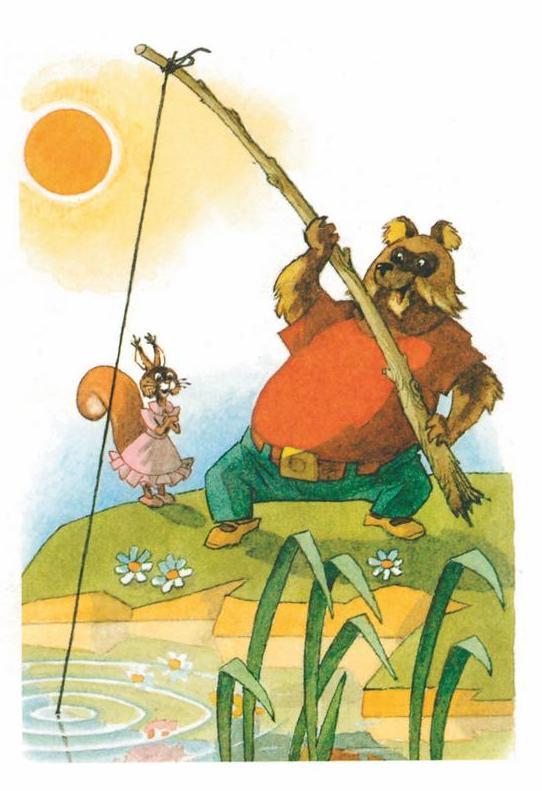 Потянул медведь удочку на себя, а она не поддаётся. Встал на задние лапы, поднатужился – опять не поддаётся. Тут белка Ленка прибежала, спрашивает: