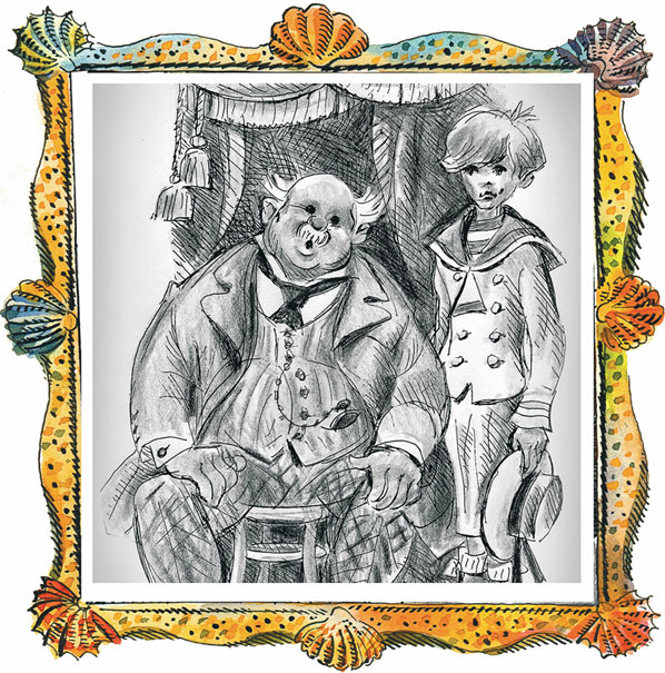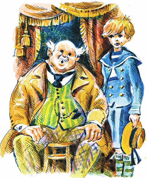 Папашу Юферса мы видим на гнутом венском стуле, который для него маловат и жидковат. На папаше модные клетчатые брюки, светлый сюртук и полосатый жилет. А поверх жилета, обтягивающего обширный живот, – тяжелая часовая цепочка с брелоком-якорем. Голова у папаши Юферса лысая, с клочками седых волос на висках. Лицо круглое, глазки тоже круглые, а нос вообще затерялся среди пухлых щек. Дядюшка старается смотреть строго, но видно, что это человек добродушного нрава, хотя, возможно, временами и вспыльчивый.