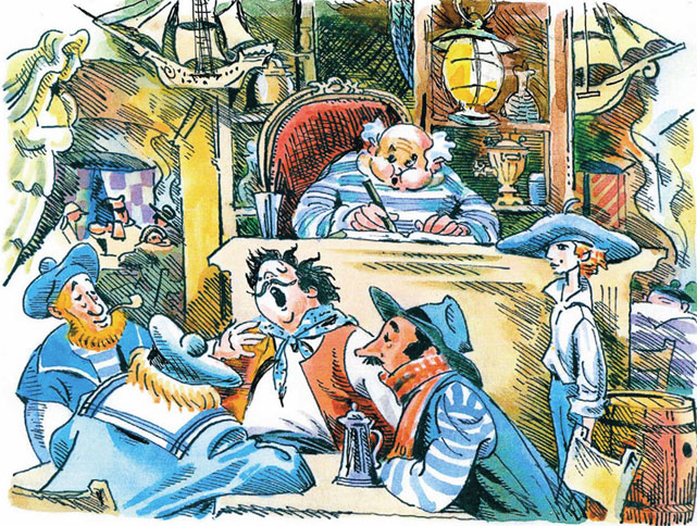 Тетушка Марта с двумя поварами хозяйничала на кухне, где шипело, булькало, дымилось и восхитительно пахло. Иногда ей помогали Гвоздик и сам папаша Юферс. Дядюшка любил и умел готовить. Но чаще он проводил время в главном зале, за стой-кой, в своем любимом кресле. Под рукой у дядюшки всегда были толстая клеенчатая тетрадь и остро очиненный карандаш. Нет, не для того, чтобы вносить в нее свои доходы и долги посетителей. Папаша Юферс внимательно слушал и записывал морские истории!