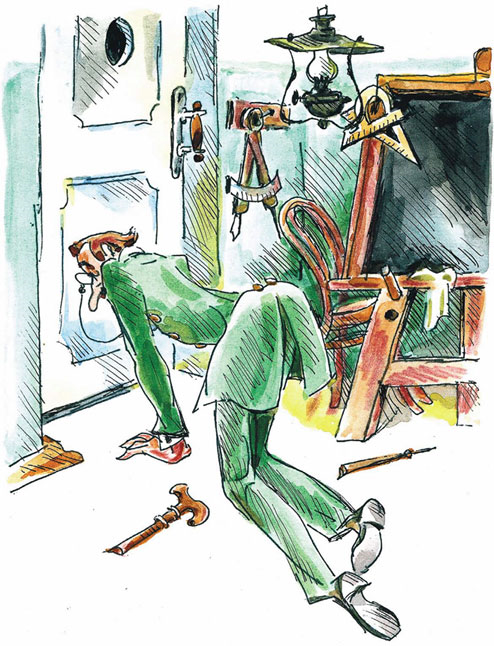 Гвоздик вздохнул и пошел. Но когда Нус Прошус взял его за плечо, случилось небывалое. Учительский стул полетел в угол, а сам наставник взмахнул в воздухе лаковыми башмаками, грохнулся на четвереньки и в таком положении выбежал за дверь, открыв ее головой. Вслед ему полетели обломки трости. Все обмерли. А Гвоздик стоял и смущенно потирал коленку, о которую перешиб палку господина Шпицназе.
