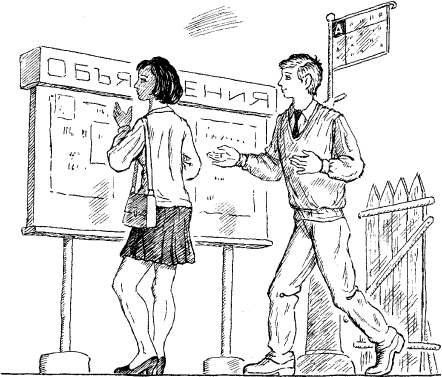 Весна. Крашеный забор, большая доска с объявлениями, афишами. Угол старого двухэтажного дома, столб с табличкой: «Остановка автобуса». Слышны гаммы: в старом доме кто-то учится играть на фортепиано. Таня читает афиши. Появляется Колecoв.Колeсов. Добрый вечер.