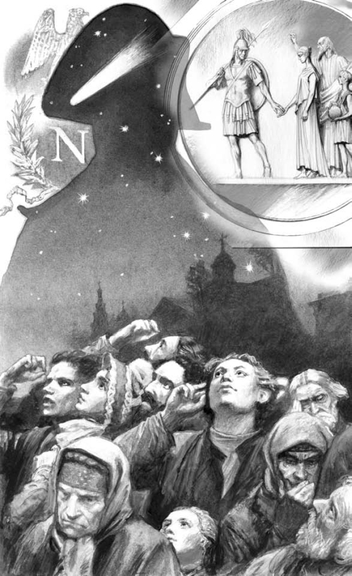 Все было неподлинным, ложным в той реальности, которую несли с собой его полки: самозваный император, самозванцы короли, герцоги, князья, лукавые понятия о чести, величии, славе, о смысле и ценностях человеческой жизни. Внешне блестящая империя, возникшая из крови и тьмы Французской революции, представляла собой какую-то огромную, стремившуюся воплотиться в жизнь иллюзию, до времени торжествующий обман, подлог. Перед этой силой не устояла Западная Европа. Власть Наполеона, как туман, как морок, поглотила страну за страной.